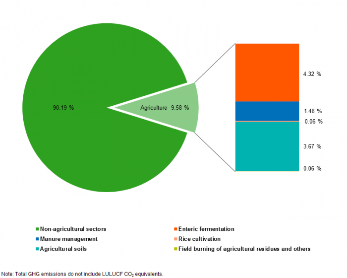 Total GHG emissions from agriculture in the European Union in 2015 (Eurostat). Enteric fermentation is methane emission from cattle.