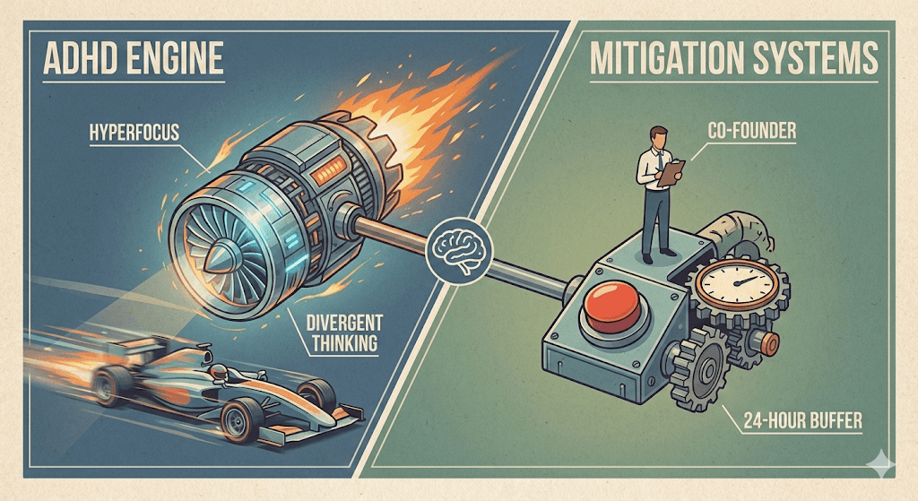 The Co-Founder Hedge (Alignment Check): The solo ADHD founder represents unmitigated risk. Investment should be contingent on a complementary co-founder structure (ideally 1-2 operators) who provide a stable operating rhythm. Their primary function is to serve as a high-friction "Say No" filter for impulse decisions and to manage the steady-state execution the ADHD brain naturally resists.